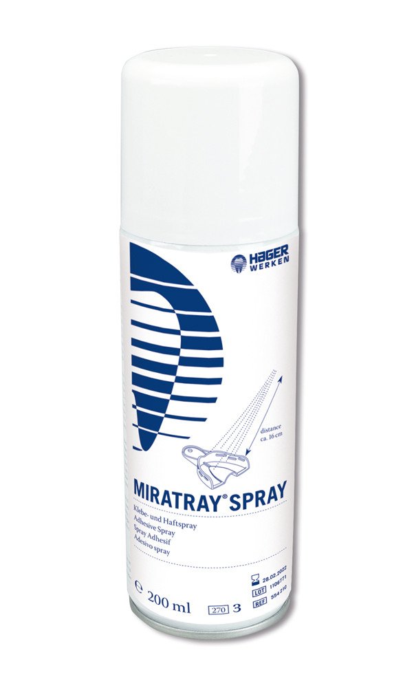 Le Miratray est une solution adhésive en aérosol. Elle permet au porte-empreinte, qu'il soit en plastique ou en métal, d'avoir une meilleure adhérence au matériau d'empreinte.