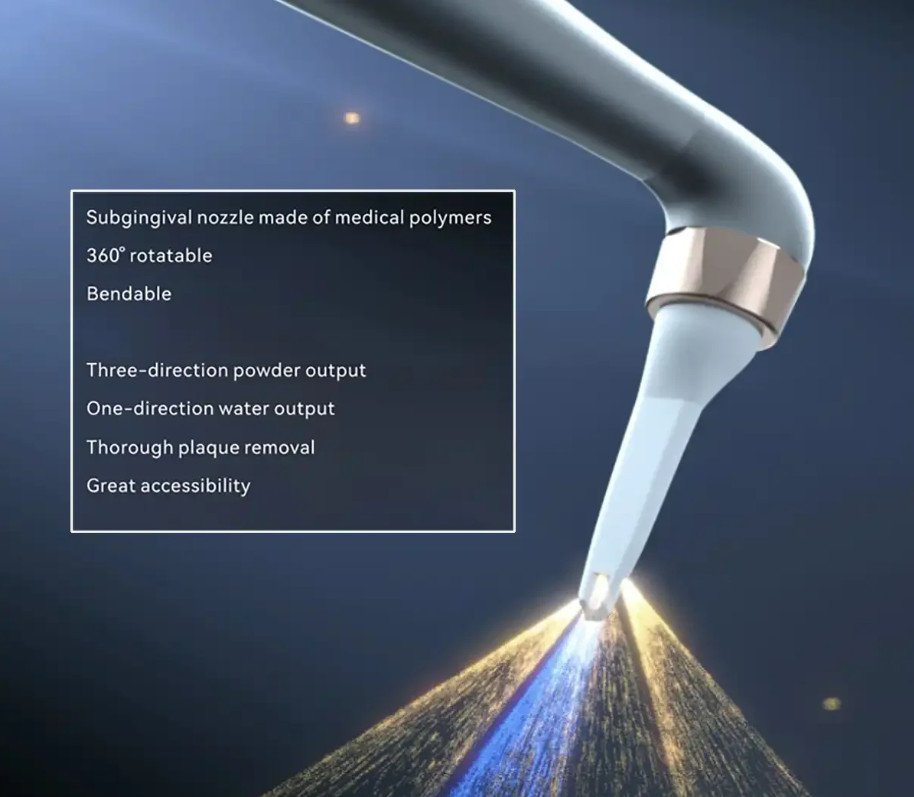 La buse sous-gingivale pivotante à 360° et pliable, fabriquée en polymères médicaux, permet d’atteindre facilement les poches parodontales et les zones anatomiquement complexes.