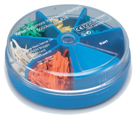 Les Coins Interdentaires KERR - Assortiment 826 sont fabriqués en érable et disposent de côtés triangulaires pour s'adapter au contour interdentaire, et d'une extrémité rectangulaire pour faciliter l'insertion et le retrait. Ils se déclinent en différentes tailles et couleurs pour s'adapter à presque toutes les formes de dent.