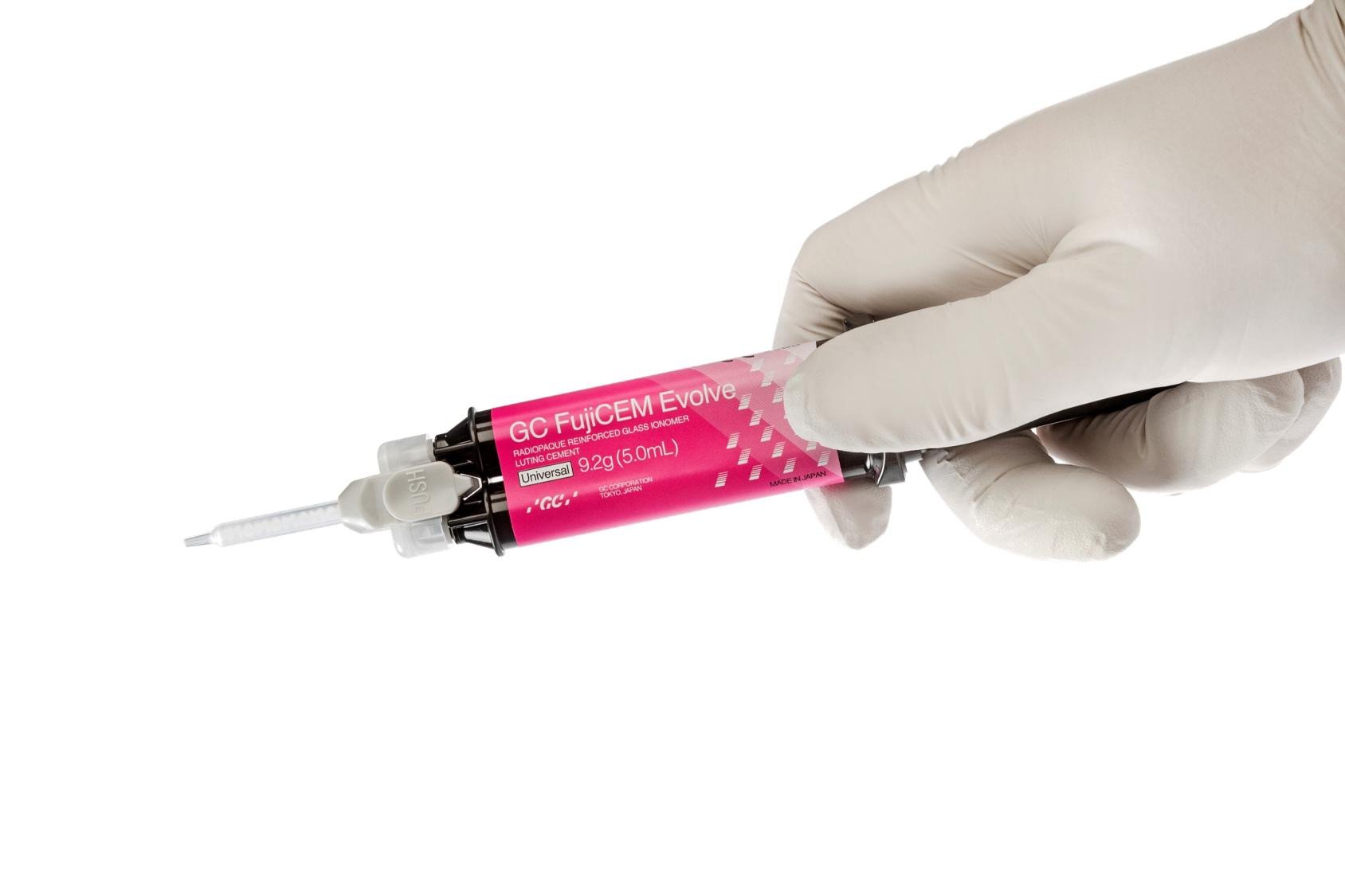 La marque GC ne cesse d'innover en terme de scellement. Après le Fuji PLUS (EWT), aujourd'hui, la marque commercialise son innovation le Fujicem Evolve. Ce ciment verre ionomère modifié par adjonction de résine permet aux professionnels de réaliser avec une facilité exceptionnelle des restaurations en zircone et à base de métallique. Le Fujicem Evolve est idéal pour la cimentation :