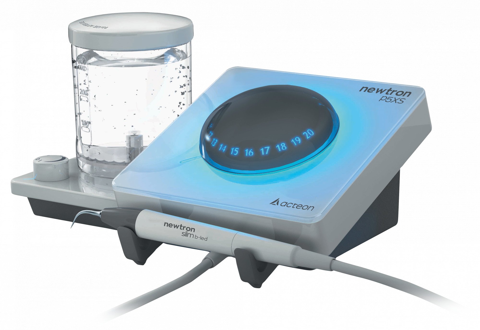 - Set détartreur P5XS B LED : Livré avec une pièce à main NEWTRON SLIM BLED avec anneau bleu, un anneau LED blanc pour NEWTRON SLIM BLED, 1 kit révélateur de plaque FLAG pour BLED + 1 clé universelle et 1 insert N°1 - N°1S - N°H3 et 1 réservoir 300ml + 1 insert n°1 ou n°1S offert