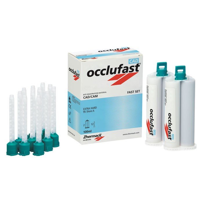 Il est idéal pour les évaluations gnathologiques, pour les diagnostics des troubles cranio-cervico-mandibulaires et pour les occlusions centrées en orthodontie. Les empreintes réalisées avec le silicone Occlufast CAD, ont un niveau de détails très élevé. D'ailleurs, le niveau de rigidité finale de l'empreinte est très élevés (95 Shore A). L'Occlufast CAD est associable avec le laser ainsi que le scanner CAD/CAM. Le temps de prise est d'environ 60 secondes.