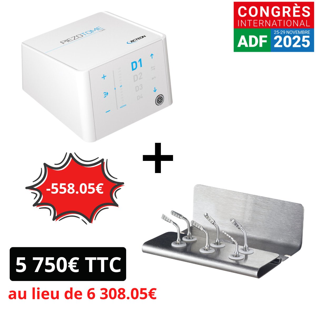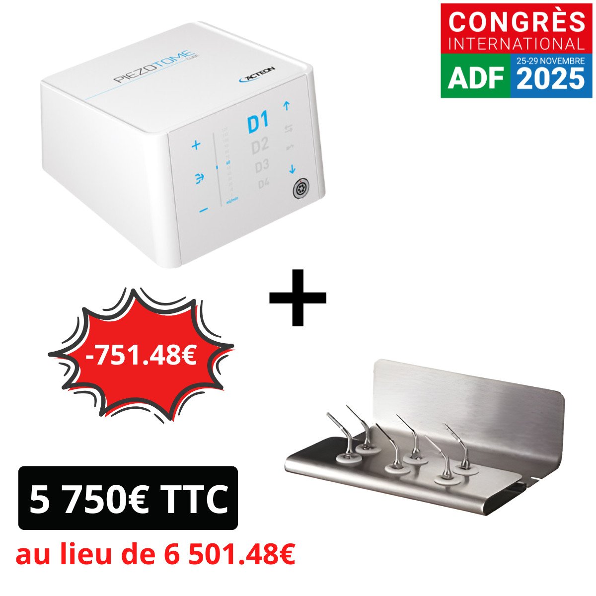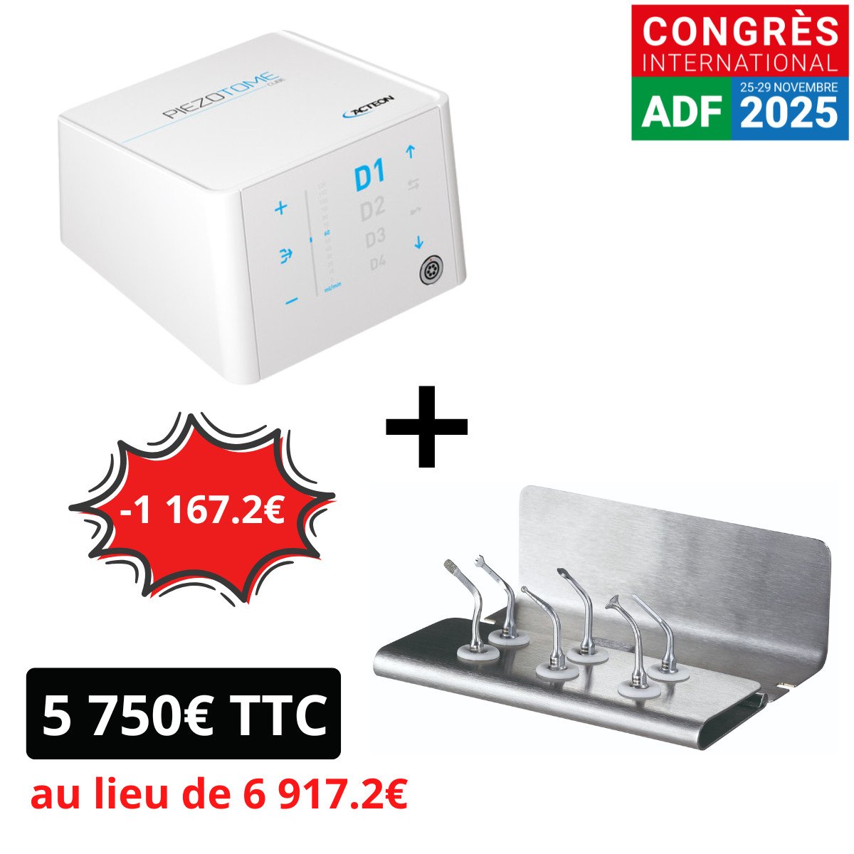 Le pack PIEZOTOME CUBE Acteon avec kit d’accessoires supplémentaire au choix est une solution complète destinée aux praticiens réalisant des actes de chirurgie osseuse, d’implantologie ou de parodontie. Grâce à l’offre ADF 2025, il est possible d’acquérir le PIEZOTOME CUBE accompagné d’un kit clinique spécialisé parmi une sélection avancée d’inserts et d’instruments.