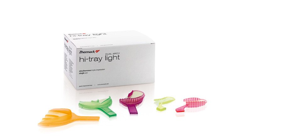 Les Hi-Tray Light Dual Arch sont des porte-empreintes en plastique transparent utilisés lors de la réalisation de la méthode de la double arcade dans les prothèses fixes. La tige de support laisse écouler le silicone pour concevoir un seul corps entre les empreintes supérieures et celles inférieures. D'ailleurs, l'épaisseur de cette dernière n'est pas visible par le patient, cela permet d'éviter les dégradations lors de l'enregistrement occlusal. De plus, le plastique transparent une visualisation plus simple de la position du porte empreinte lors de la réalisation.
