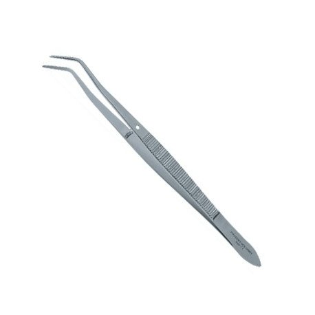 La précelle Meriam, de Prodont Holliger, permet de saisir les petits objets plus facilement. Son extrémité est courbée et il existe en différentes tailles. Cette précelle est en acier inoxydable avec un manche strié, de longueur 16 cm.