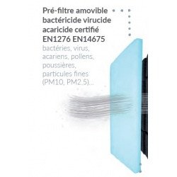 Dans le bloc de filtre du purificateur d'air, il y a plusieurs couches dont un préfiltre bactéricide, virucide et acaricide, certifié EN 1276 et EN 14675. Le préfiltre a différentes indications comme par exemple la capture des macro-particules (cheveux, poussières, ...). Il permet aussi de lutter contre les bactéries, les virus et les acariens grâce au traitement qu'il a reçu. Ainsi, il allonge la durée de vie du filtre HEPA car il est lavable et interchangeable.