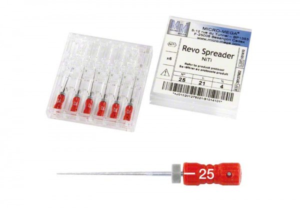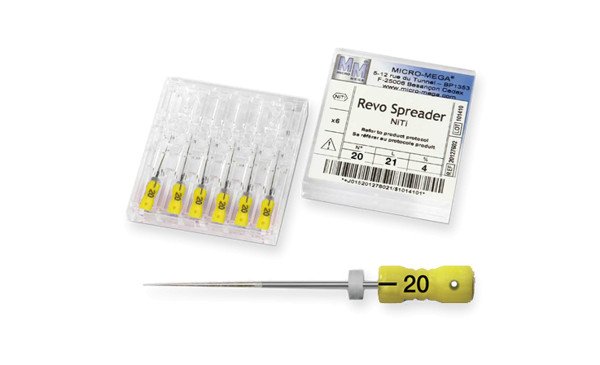 Les limes Revo Spreader de la marque Micro Mega sont des instruments qui possèdent une grande aptitude à compresser la Gutta-Percha grâce à sa pointe de 90°, faisant de ce type de lime un outil parfait pour l'obturation par condensation latérale des canaux préparés avec des limes de Micro Mega.