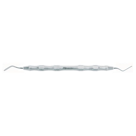 La spatule à bouche Heidemann Design, de Prodont Holliger, est un instrument à double extrémité travaillante, l'une est courbée à plat, l'autre est courbée sur chant. Elle possède un manche ergonomique en acier inoxydable pour une meilleure prise en main.