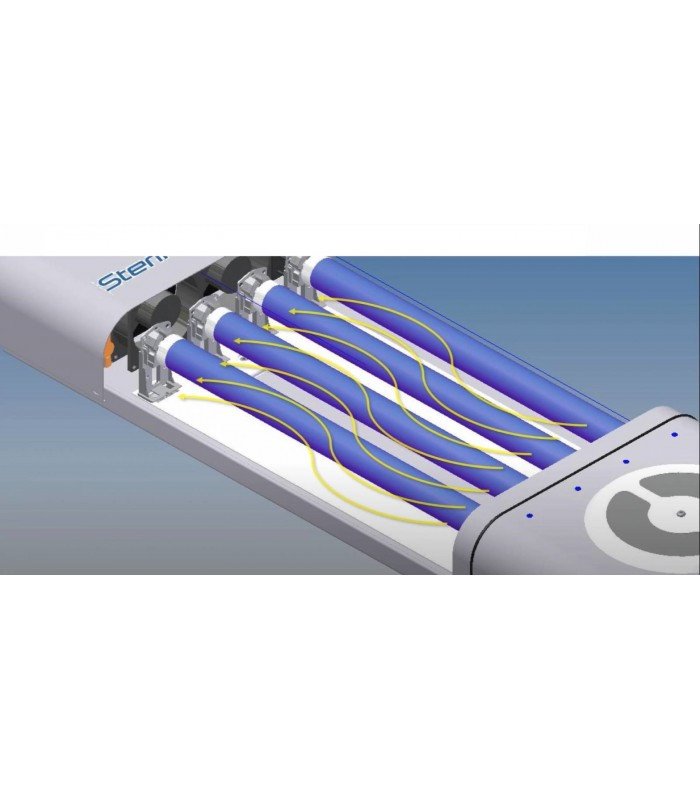 Le Sterilair Pro repose sur un système de ventilation forcée qui suit un cycle fermé. Le dispositif aspire l'air qui passe d'abord au travers d'un filtre mécanique, se trouvant dans la bouche d'entrée de l'appareil. Ce premier filtre stoppe principalement les polluants les plus grossiers. Ainsi les lampes germicides ne sont pas abîmées. Ensuite, l'air entre en contact direct forcé avec un tube à vapeurs de mercure, qui permet une action germicide optimale, grâce à l'émission de rayons UVC. Le boîtier en Antiacorodal possède un blindage à fort pouvoir réfléchissant qui permet de réflexion des rayons UVC. Enfin, l'air est expulsé, par l'orifice de sortie, qui permet l'élimination des bactéries microbiologiques.