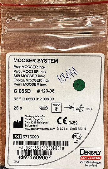Le pivot des tenons Mooser 055D de Dentsply Maillefer sont en inox métalocompatibles. Ils disposent de gorges hélicoïdes qui permettent une évacuation optimale du ciment de scellement.