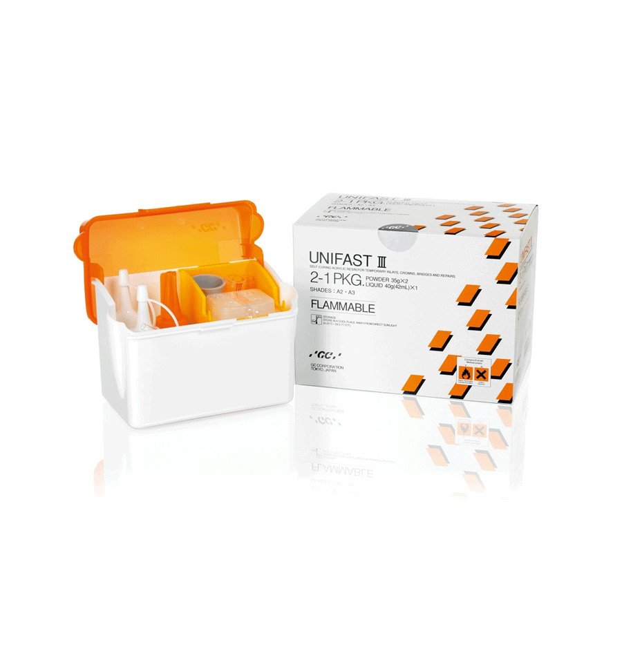 L'Unifast III est doté de résine acrylique autopolymérisables, le composite est utilisé pour la réalisation d'inlays, de bridges, de couronnes ainsi que lors de réparations.